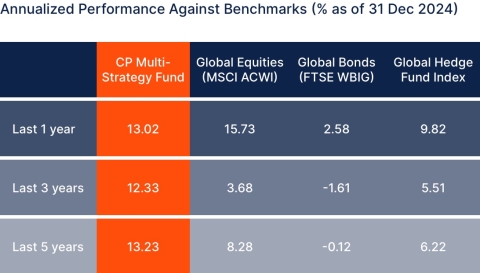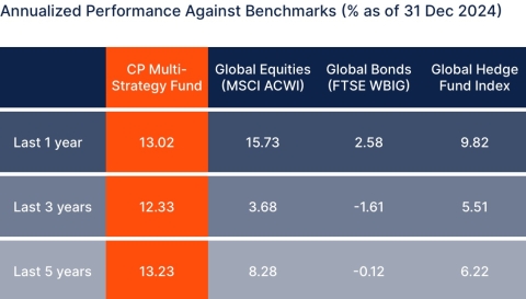 CP Global Asset Management Private Limited operates as a Capital Markets Services Licensee (CMS101503) – Licensed Fund Management Company (LFMC/AI) to conduct business in fund management under the Securities and Futures Act. The information shown in this website does not constitute an offer or solicitation to anyone in any jurisdiction in which such offer is not authorised or to any person to whom it is unlawful to make such offer or solicitation. Past performance of the CP Multi-Strategy Fund is not necessarily indicative to its future performance.